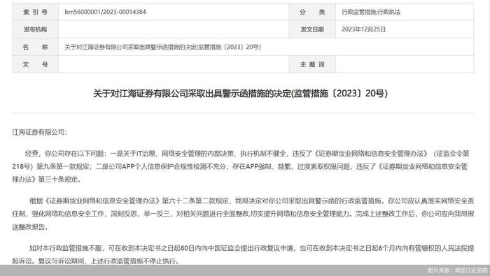 12月25日,黑龙江证监局发布公告表示,江海证券存在关于IT治理、网络安全管理的内部决策、执行机制不健全;公司App个人信息保护合规性检测不充分,App强制、频繁、过度索取权限等问题。因此,黑龙江证监局决定对江海证券采取出具警示函的行政监管措施。