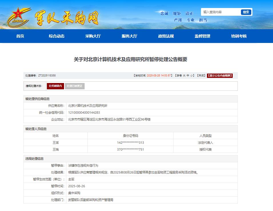 根据最新处理通报,北京计算机技术及应用研究所因"围标串标"违规行为,自2025年8月27日起被暂停全军采购资格。处理文件显示,其法定代表人王斌(身份证号142313)和授权代表毕琪(身份证号110071)被列入处理人员名单。