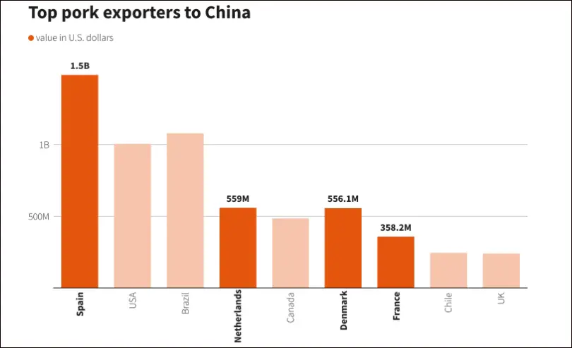 西班牙、法国、丹麦和荷兰为欧盟主要对华猪肉产品供应国